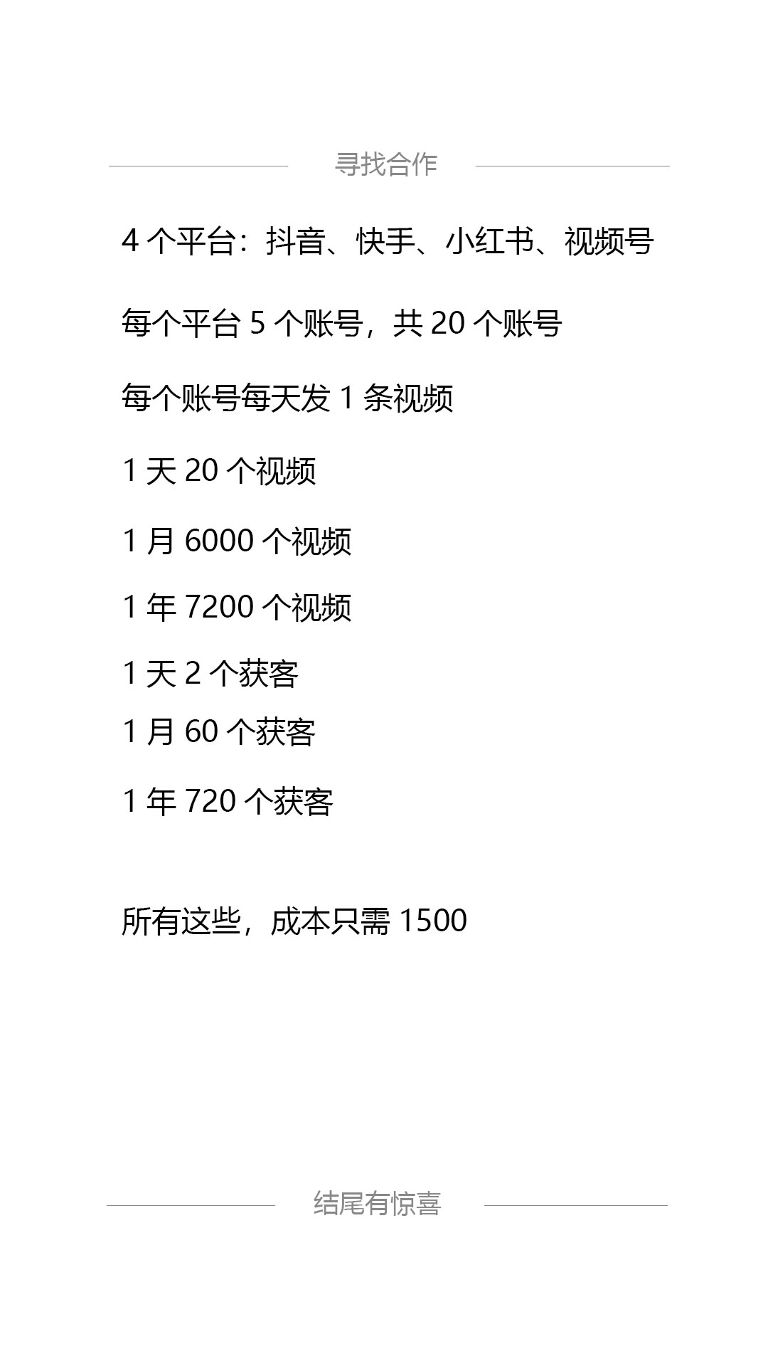 缺点:前期准备时间长,奇效慢。需要注册大量企业号和员工号(缺电话号码),做认证(认证费用),写文章剪视频(工作量大),还要购买分发工具(费用)等。