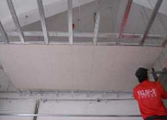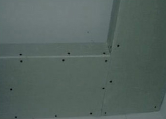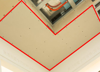 1、吊顶转角部位的纸面石膏板安装切割成“L型”采用整板铺装。