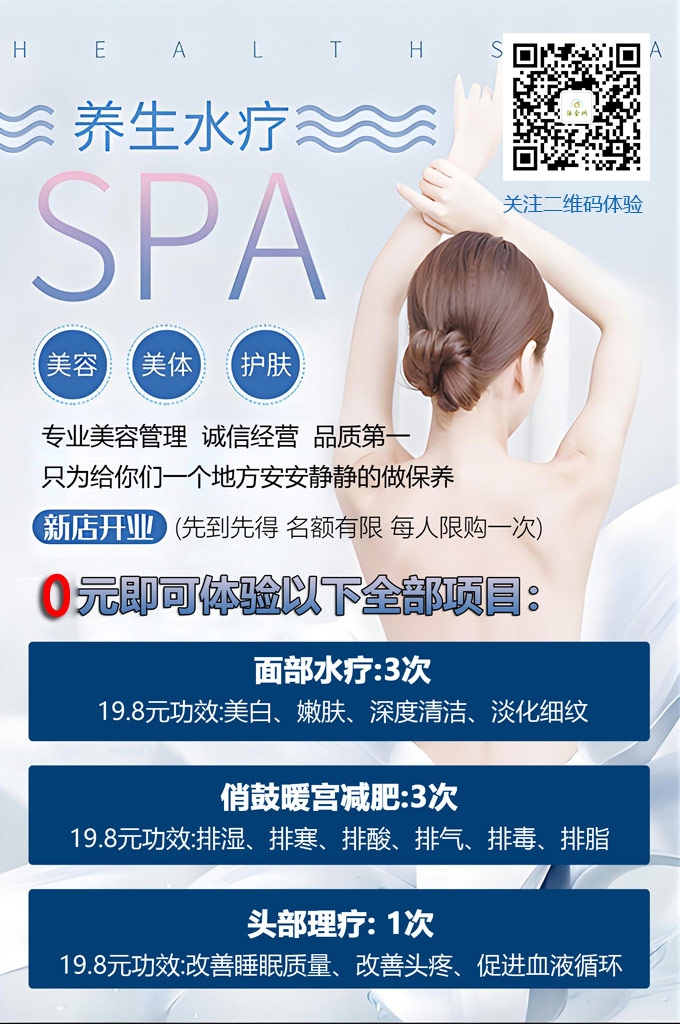 带各位女性薅羊毛时刻,免费体验养生水疗SPA2024-05-13新店开业让利大酬宾活动,0元即可体验一下全部项目:面部水疗 3次,俏鼓暖宫减肥 3次,头部理疗 1次