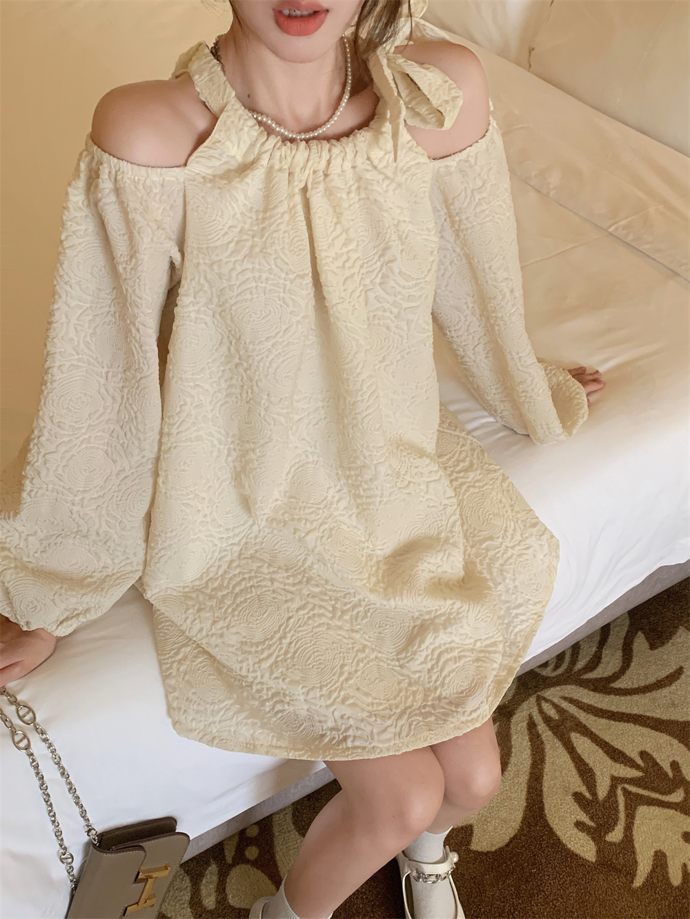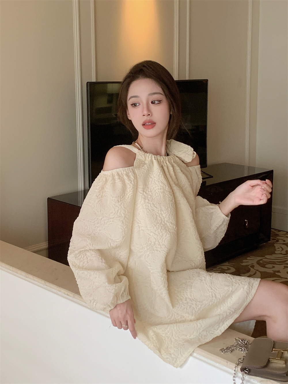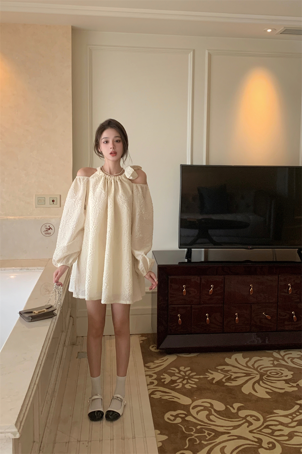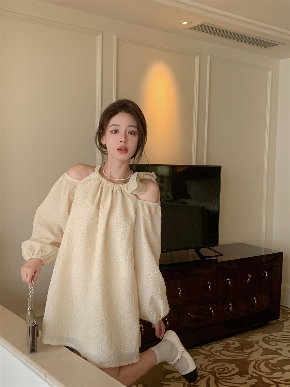 实拍实价~ 法式甜美挂脖露肩温柔风宽松显瘦长袖衬衫连衣短裙