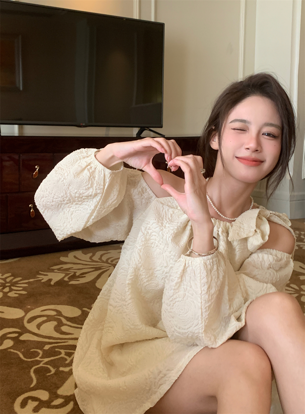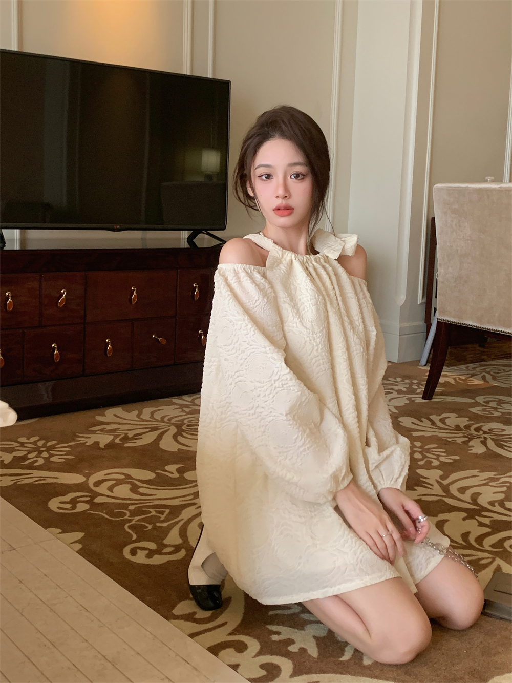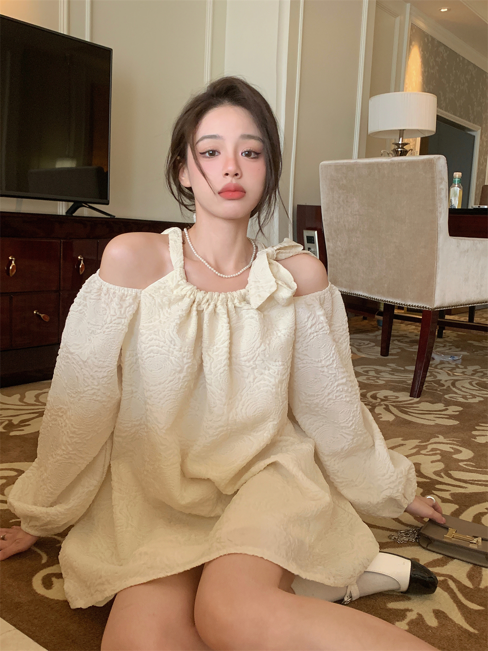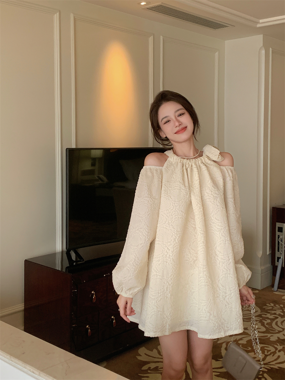 实拍实价~ 法式甜美挂脖露肩温柔风宽松显瘦长袖衬衫连衣短裙