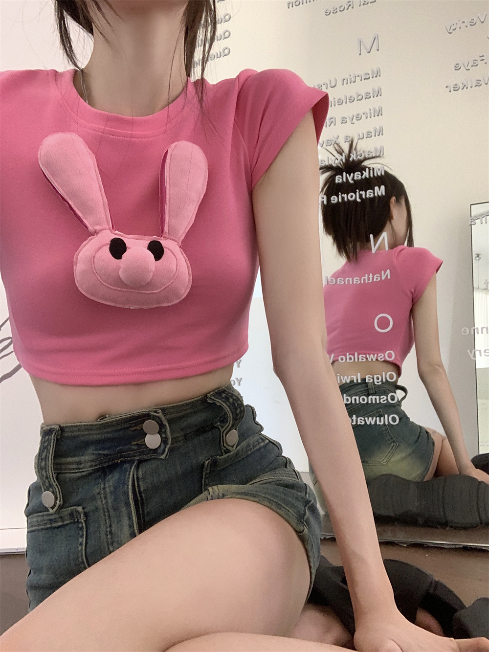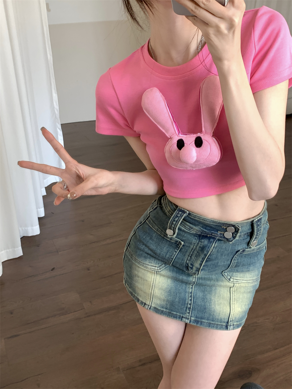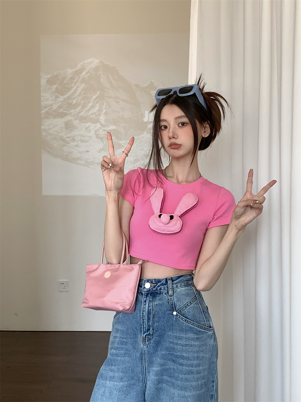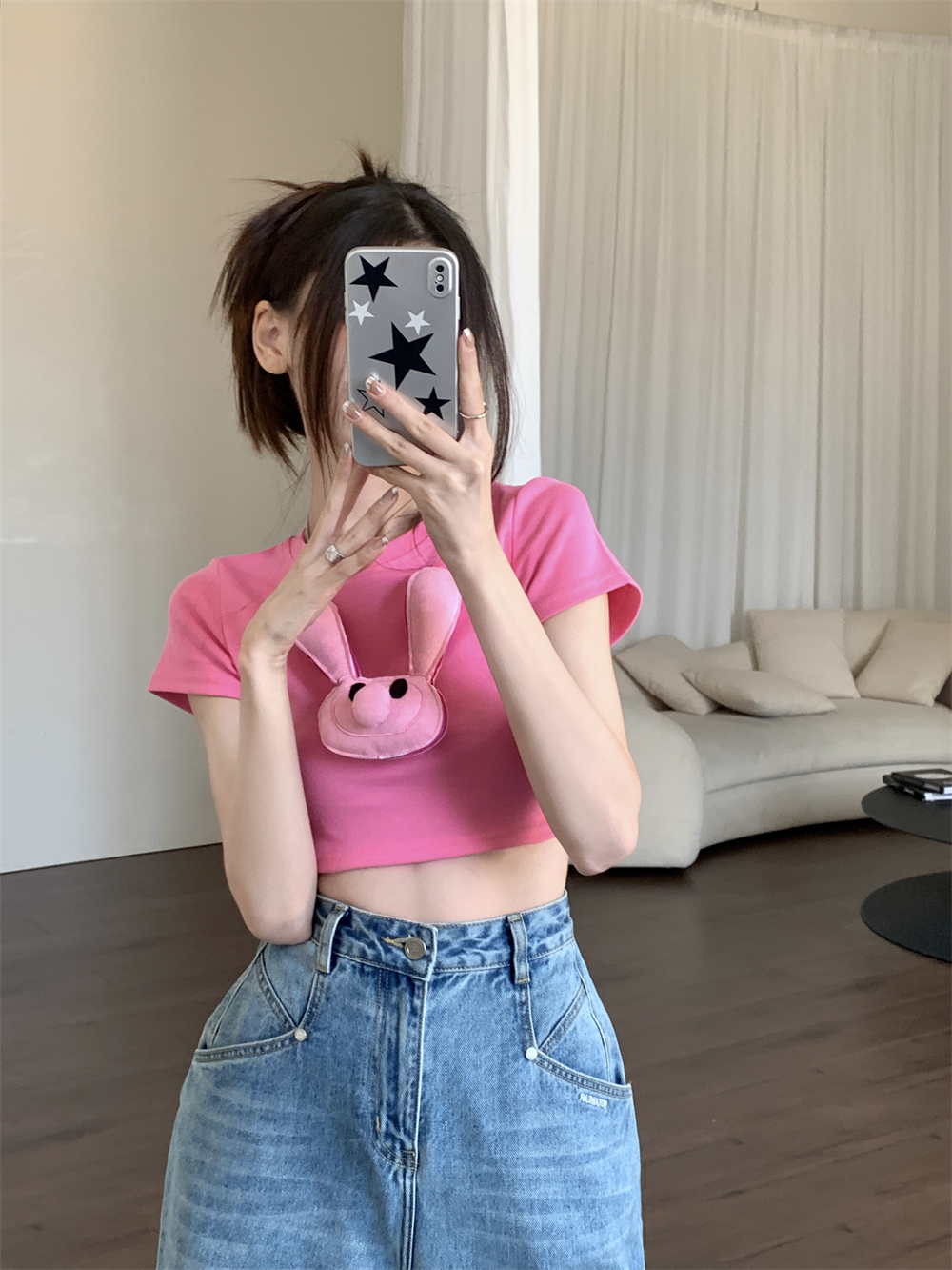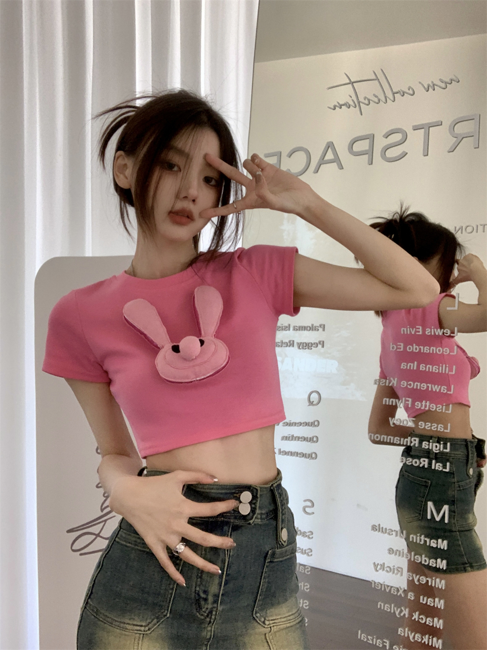 实拍实价~ 韩版辣妹露脐性感修身显瘦短款兔子圆领短袖长短款T恤