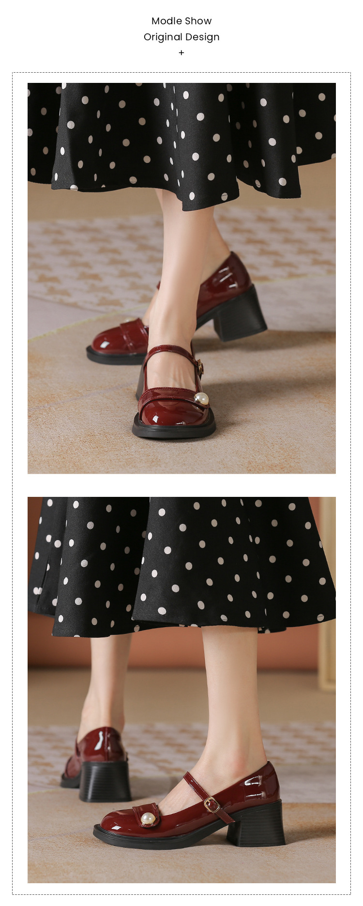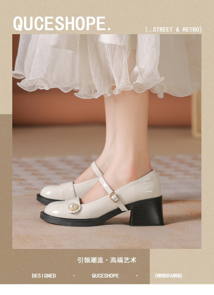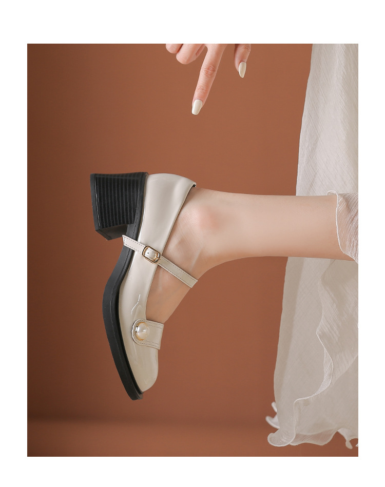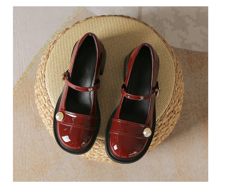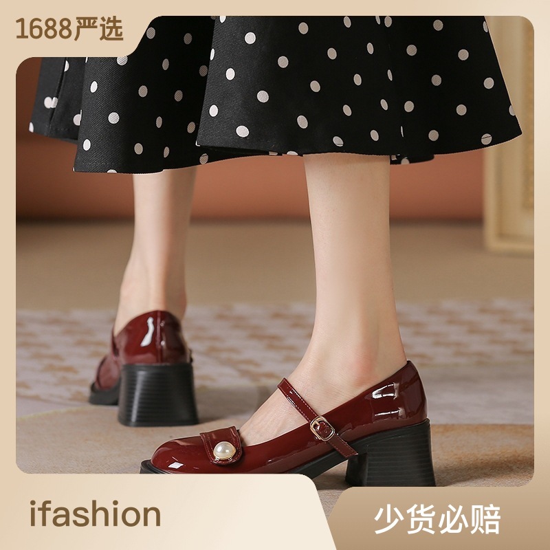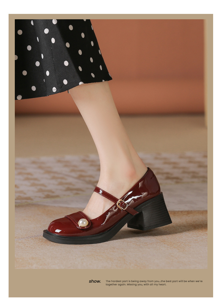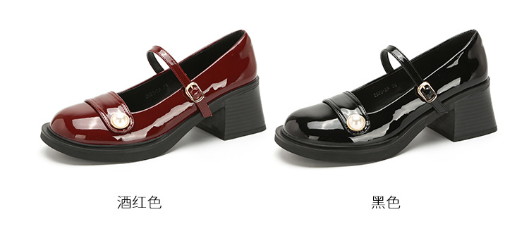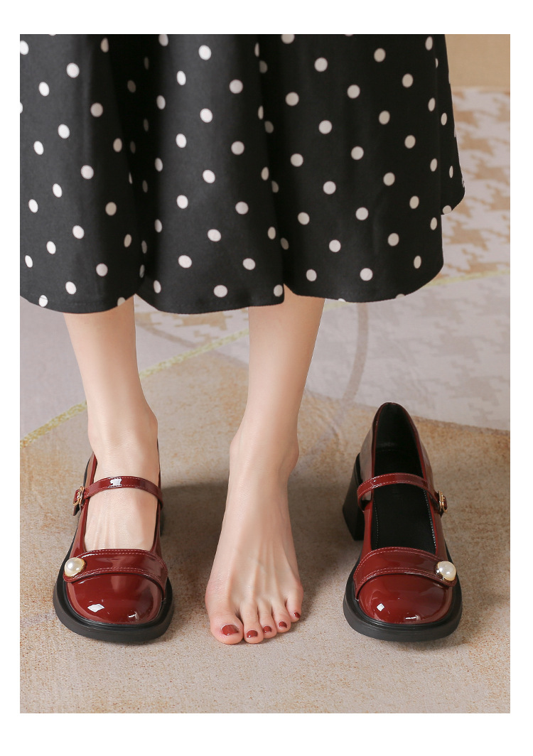 红色高跟鞋2023新款圆头甜美珍珠一字扣玛丽珍单鞋法式粗跟小皮鞋