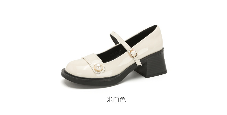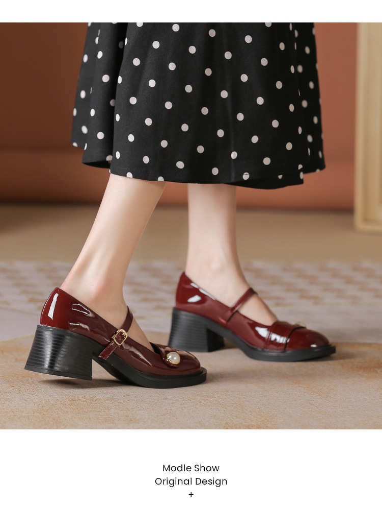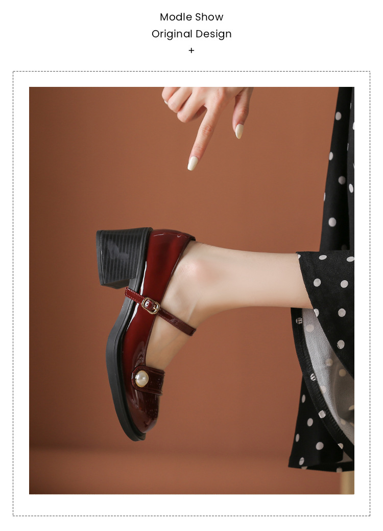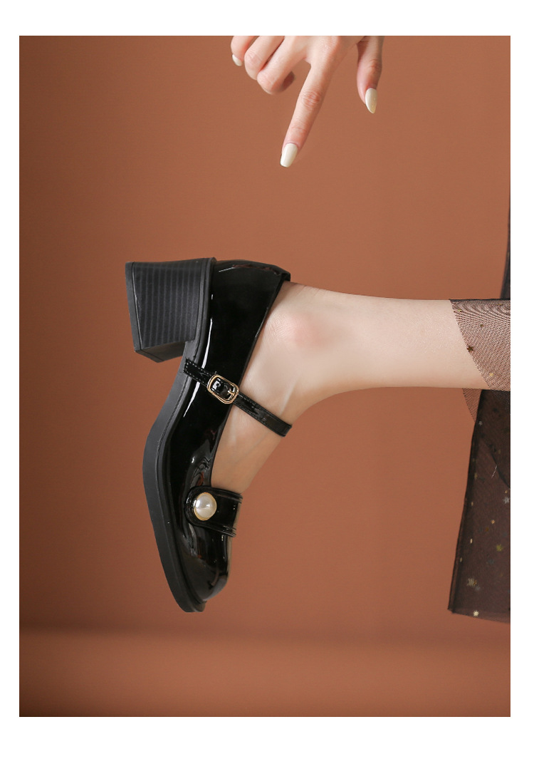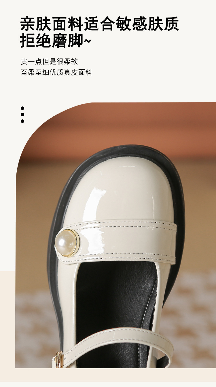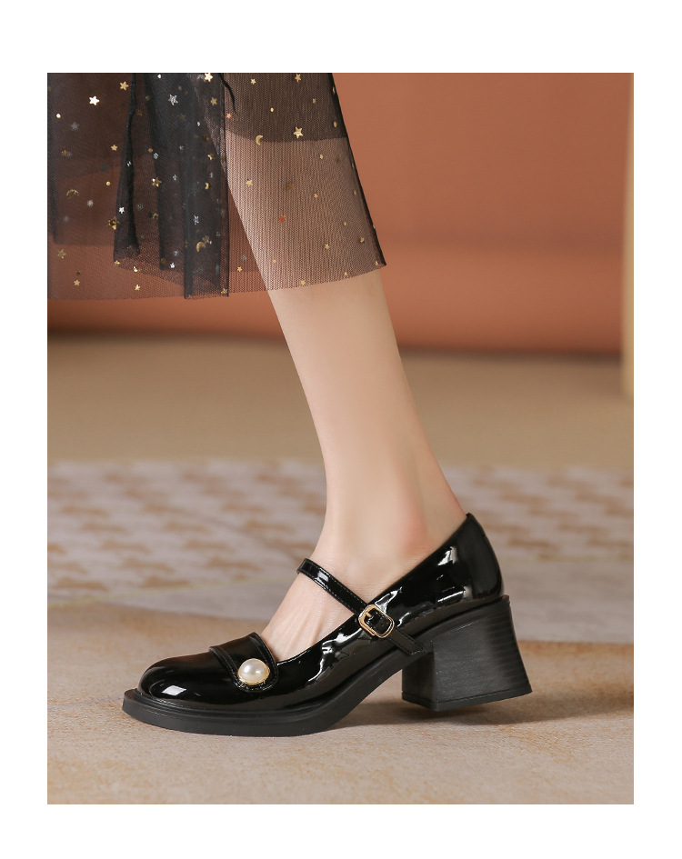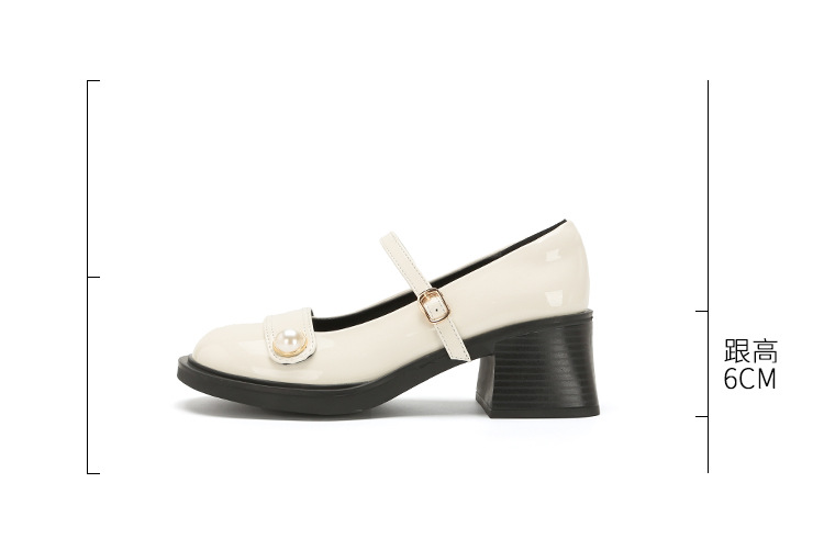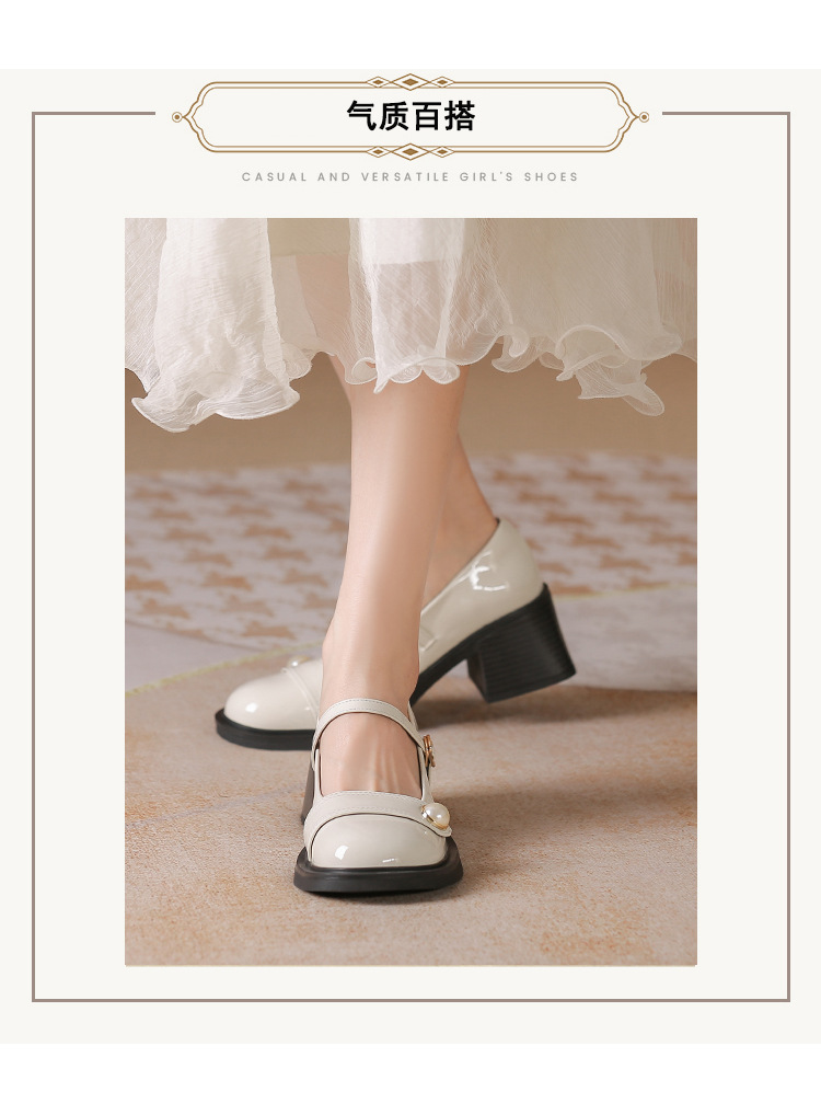 红色高跟鞋2023新款圆头甜美珍珠一字扣玛丽珍单鞋法式粗跟小皮鞋