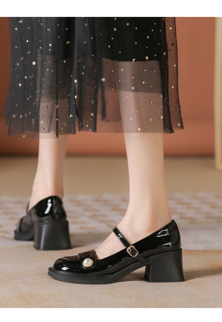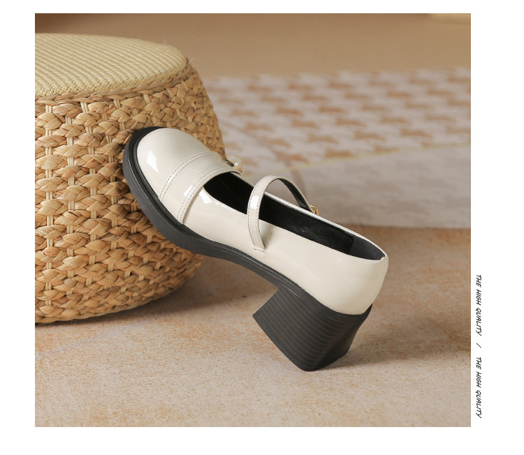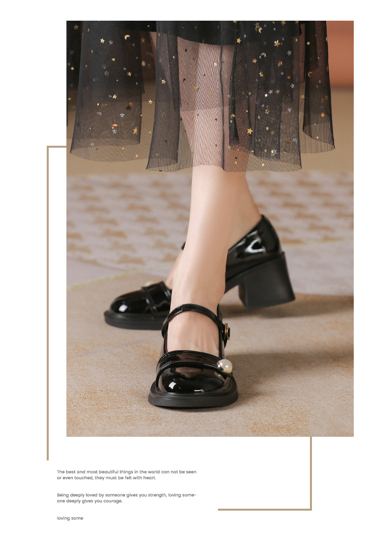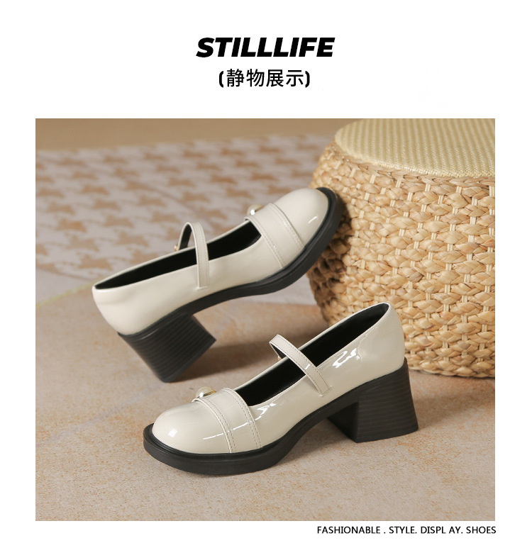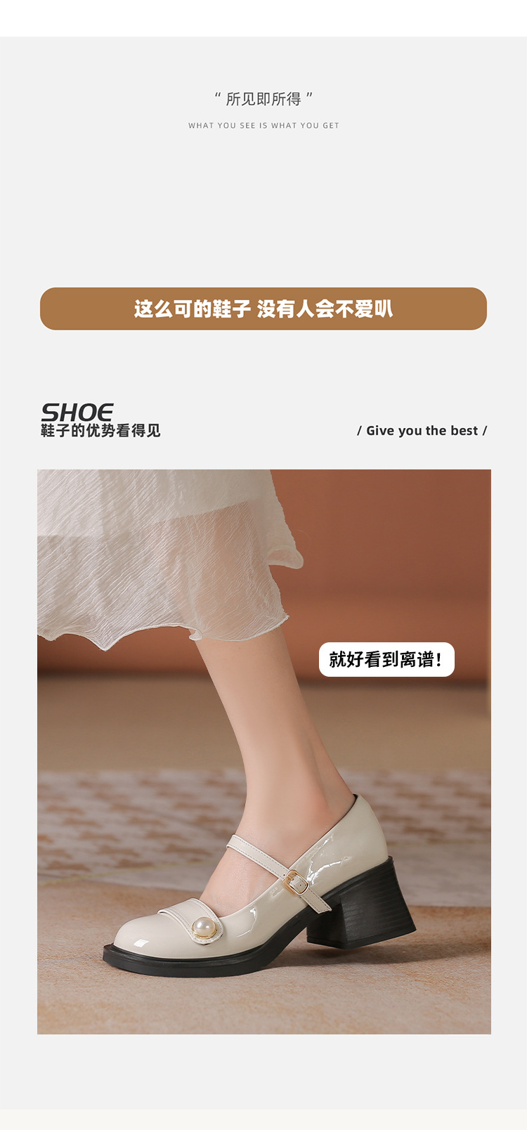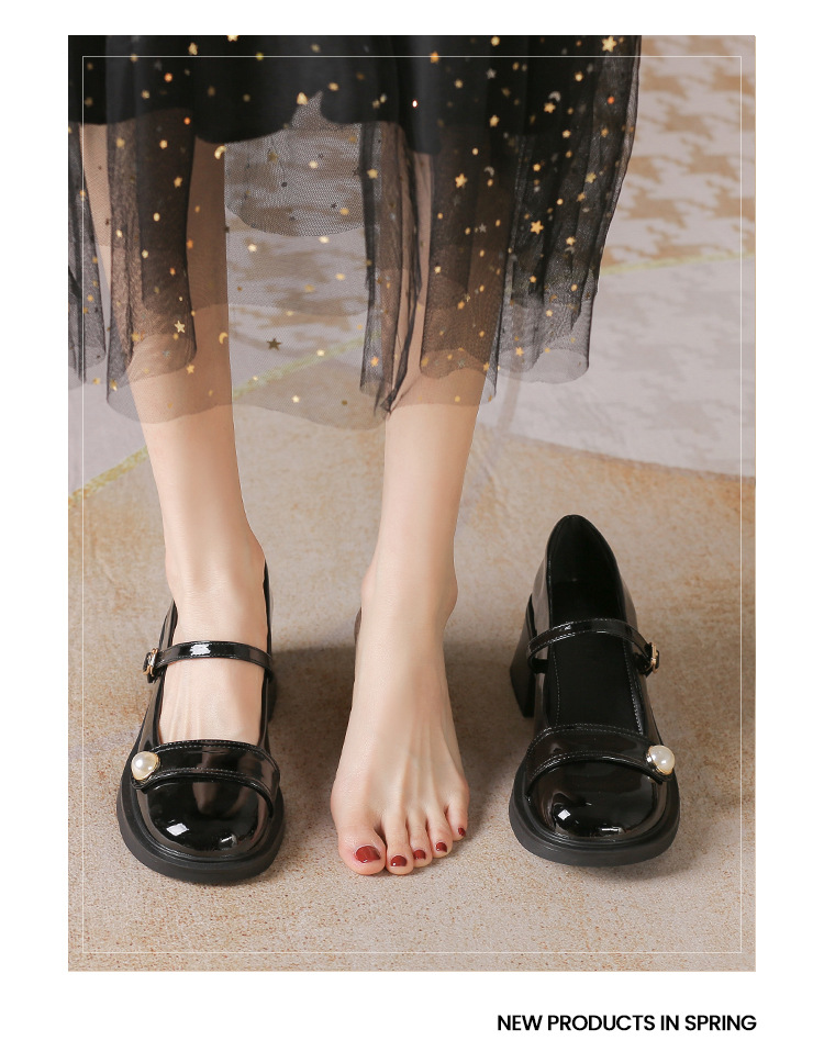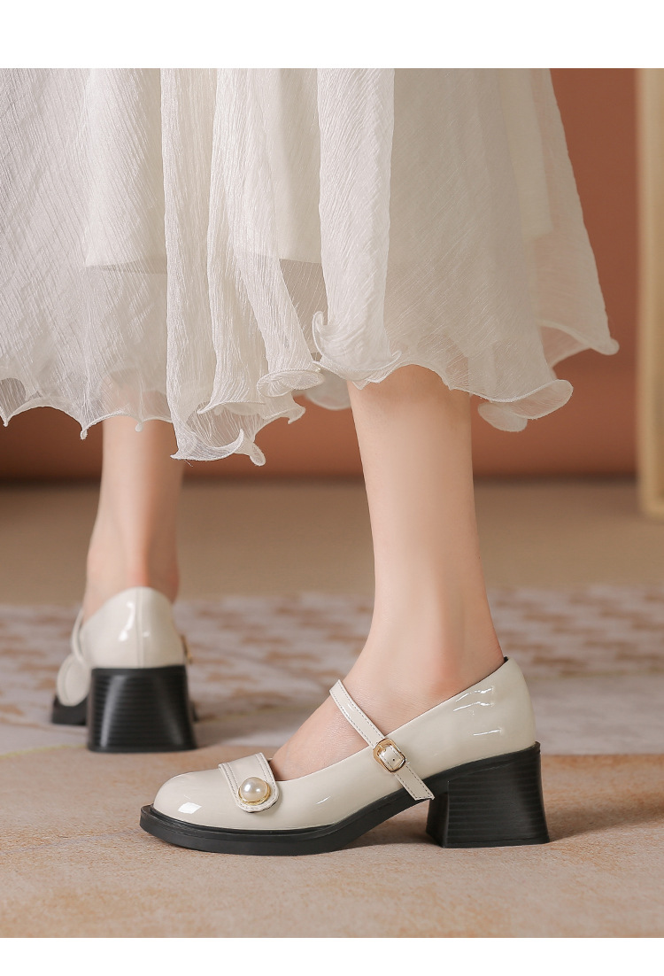 红色高跟鞋2023新款圆头甜美珍珠一字扣玛丽珍单鞋法式粗跟小皮鞋